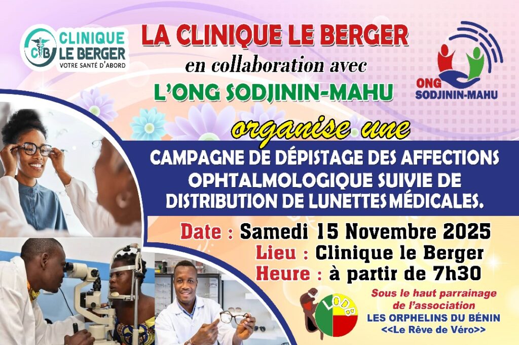 La Clinique Le Berger, en collaboration avec l’ONG SODJININ-MAHU, organise le samedi 15 novembre 2025 une grande campagne de dépistage des affections ophtalmologiques, suivie de la distribution de lunettes médicales pour les patients qui en auront besoin. L’activité se déroulera au sein de la Clinique Le Berger à partir de 7h30, sous le haut parrainage de l’association Les Orphelins du Bénin « Le Rêve de Véro ». Cette initiative vise à faciliter l’accès aux soins oculaires pour tous. Venez faire contrôler votre vue et parlez-en autour de vous ! 👓
